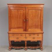 Teakhouten kruispootkabinet, het interieur met drie afsluitbare deurtjes en drie lades, de onderkast ook met drie lades, de poten verbonden door accoladevormige regels, 18e eeuw -aan de rechterzijkant twee defecten aan het fineer door de deuvels-, 201 × 156 × 55,5 cm