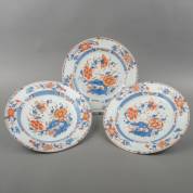 Drie Chinees porseleinen Imari schotels met bloemdecor, 18e eeuw -één met sterbarst in de spiegel-, Ø 38 cm