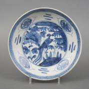 Chinees steengoed Swatow schotel met blauw-wit vogeldecor, eind 16e/begin 17e eeuw, Ø 26 cm