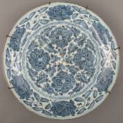 Grote Chinees porseleinen 'Swatow' schotel met blauw-wit floraal decor, 16e/17e eeuw -imperfecties in glazuur, haarlijn-, Ø 50 cm