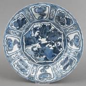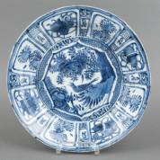Chinees kraakporseleinen schotel met blauw-wit decor van vogel op rots, de rand met bloemen en kostbaarheden in vlakverdeling, Wanli -rand gelijmd-, Ø 35 cm