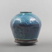 Blauwgeglazuurde Chinees aardewerk pot, mogelijk Yixing, 18e/19e eeuw, 26 × Ø 28 cm, op houten basement
