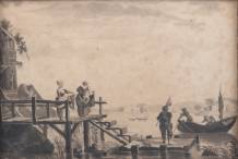 Franse School: riviergezicht met vissers, gewassen inkt op papier, 18e/19e eeuw -enkele roestvlekjes-, 19 × 17 cm