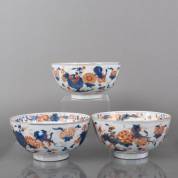 Drie Chinees porseleinen Imari kastkommen met decor van bloemen en granaatappels, gemerkt, eerste helft 18e eeuw -één met haarlijn in de rand van circa 7 cm-, 11,5 × 22,5 cm