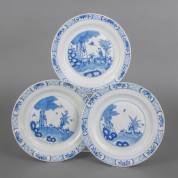 Serie van drie Chinees porseleinen dubbelborden met blauw-wit decor: lange lijs, spelende zotjes, en zotje op ladder, Kangxi gemerkt, 19e eeuw -één met vele chips en twee barsten, één met twee chipjes en één met chipje-, Ø 26 cm