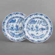 Paar Chinees porseleinen borden met blauw-wit decor van drie figuren in landschap, Yongzheng/Qianlong -randschilfertjes-, Ø 23 cm