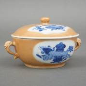 Chinees porseleinen café au lait dekselkom met blauw-wit kostbaarhedendecor en twee verticale oortjes met mascarons, Kangxi, herkomst: particuliere verzameling Amsterdam, aangekocht bij veiling Sotheby's, Amsterdam, Chinese & Japanese ceramics, oktober 1992, kavel 77 -dubbele haarlijn in dekselrand, kleine opgevulde chip aan de binnenrand kom, één oortje met kleine restauratie aan onderzijde-, 10 × Ø 14,5 cm