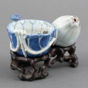 Chinees porseleinen lotusvormige waterdruppelaar met blauw-wit en koperrood decor, en een krabbetje aan de binnenzijde van het lotusblad, Kangxi, staand op opengewerkt houten basement -krab mist enkele pootjes-, 5,5 × 12 × 8,5 cm zonder basement, herkomst: particuliere verzameling Amsterdam, aangekocht bij veiling Sotheby's, Amsterdam, Chinese & Japanese ceramics, oktober 1992, kavel 15, voor vergelijkbare exemplaren zie: Het Rijksmuseum, Amsterdam, registratie no. AK-RAK-1972-3, en veiling Rob Michiels, Brugge, juni 2025, kavel 320