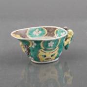 Chinees porseleinen famille verte libation cup met decor van mascarons en draakjes in reliëf, Kangxi, 6,5 × 13,5 × 7,5 cm, herkomst: particuliere verzameling Amsterdam