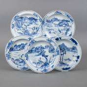 Vijf Chinees porseleinen 'Master of the rocks' borden met blauw-witte landschapsdecors, divers gemerkt, Kangxi -alle met randdefecten, twee met haarlijnen/barsten-, Ø 21,5 cm