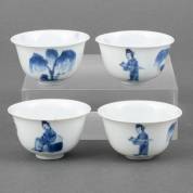 Vier Chinees porseleinen kommetjes met blauw-wit decor van twee lange lijzen, Chenghua gemerkt, Kangxi -drie met haarlijn(en)-, 3,5 × Ø 6 cm