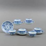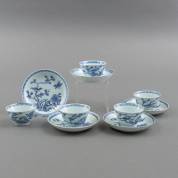 Zes Chinees porseleinen kommetjes en vijf schoteltjes met blauw-wit floraal decor, 18e eeuw -één kommetje en één schoteltje gaaf, de rest met randschilfers en haarlijnen, één schoteltje mist scherfje-, schoteltjes Ø 11,5 cm