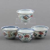 Serie van vier Chinees porseleinen kommetjes met famille rose bloemdecor en melk-en-bloed sprinkhanen in cartouches, in het plat een melk-en-bloed decor van visser, eerste helft 18e eeuw -randschilfers, één met glazuurbarstje-, 3,5 × 6 cm