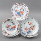 Twee Chinees porseleinen Imari diepe borden, Ø 22,5 cm, drie Chinees porseleinen Imari borden, Ø 23 cm, en twee Chinees porseleinen Imari dubbelborden, Ø 25 cm, alle met gelijkend decor van pioenrozen bij een rots, Qianlong -defecten-