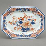 Achthoekige Chinees porseleinen Imari dienschaal met bloemdecor, 18e eeuw -klein opgevuld randchipje-, 28 × 38 cm