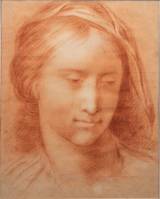 Omgeving Hendrick Goltzius (1558-1617), schets van een vrouwenhoofd met sluier, roodkrijttekening, niet gesigneerd, 17e eeuw -meerdere scheurtjes-, 31,5 × 25 cm