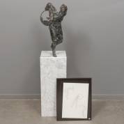 Albert Zweep (1957-2021), bronzen sculptuur: mannentorso met schild, op marmeren basement, niet gesigneerd, 135 × 30 × 45 cm, daarbij: kopie van studietekening in lijst