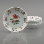 Vijf Chinees porseleinen gelobde famille rose schoteltjes met bloem- en insectendecor, 18e eeuw -randdefecten, twee met haarlijn-, Ø 14 cm