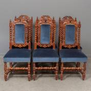 Set van zes eiken Mechelse eetkamerstoelen, de rugleuning met rankendecor, de zitting met blauw velours, het onderstel met getorste stijlen, 19e/20e eeuw