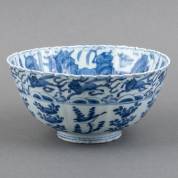 Chinees kraakporseleinen kastkom met gecontourneerde rand en blauw-wit decor: aan de buitenzijde vliegende paarden en bloemen, aan de binnenzijde en op het plat een landschapsdecor, gemerkt, Wanli -twee haarlijnen en een kleine randrestauratie-, 10,5 × Ø 21 cm