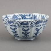 Chinees kraakporseleinen kastkom met gecontourneerde rand en blauw-wit decor: aan de buitenzijde vliegende paarden en bloemen, aan de binnenzijde en op het plat een landschapsdecor, gemerkt, Wanli -haarlijnen, stukje gelijmd en bakfout in de rand-, 10,5 × Ø 21,5 cm