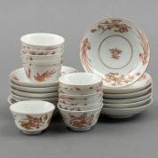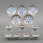 Twaalf Japans porseleinen kommetjes en schoteltjes met verguld en ijzerrood bloem- en vogeldecor, 18e eeuw -één schoteltje gebarsten, één met haarlijn, één met klein randchipje-, kommetje 3 × Ø 6 cm, schoteltje Ø 9,5 cm