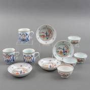 Drie Chinees porseleinen Imari kopjes -chips-, en vier Chinees porseleinen famille rose kommetjes en schoteltjes met figurendecors -defecten-, alle 18e eeuw, hoogte kopjes 7,5 cm