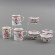 Vier Chinees porseleinen kommetjes met bloem- en vruchtendecor, Yongzheng/Qianlong, en drie Chinees porseleinen kopjes met pioenroosdecor, Qianlong -alle met defecten-, hoogte kopjes 6,5 cm