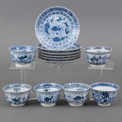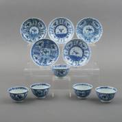 Vijf Chinees porseleinen kommetjes en vier schoteltjes met blauw-wit decor: vogels op bloesemtak, 18e eeuw -alle met randschilfers, twee kommetjes met haarlijnen, één schoteltje gelijmd-, daarbij: één schoteltje met gelijkend blauw-wit decor, 18e eeuw -randschilfers, haarlijn, donkere cirkel om standring-, schoteltjes Ø 11,5 cm