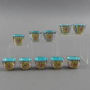 Tien email beschilderde koperen kopjes, China, 19e eeuw, bestaande uit drie zeer gelijkende setjes -stukjes emailverlies-, 3,2 × 4,6 × 4,6 cm
