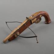 Handformaat notenhouten kruisboog met messing monturen, de beugel om de trekker is gemonogrammeerd CB, 19e eeuw -veer zit aan één kant los-, 37 × 24 cm