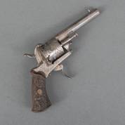 7mm penvuur revolver met gegraveerde trommel en frame, de kolf versierd met acanthusranken, vermoedelijk België, 19e eeuw, 18 × 10 × 5 cm