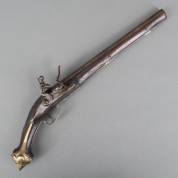 Vuursteenpistool met stalen loop en notenhouten kolf, messing inleg op de loop, en trekkerbescherming, 18e eeuw, 51,5 cm