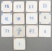 Dertien aardewerk tegels met blauw-witte kinderspelen, 17e/18e eeuw -randbeschadigingen-, 13 × 13 cm