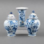 Driedelig Delfts aardewerk kaststelletje met blauw-wit bloemdecor, bestaande uit paar dekselvaasjes en trompetvaasje, niet gemerkt, midden 18e eeuw -glazuurslijtages-, trompetvaasje 12 × Ø 7,5 cm