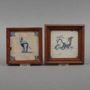 Twee Delfts aardewerk tegels met blauw-wit decor van mythische wezens, 17e eeuw, in eiken lijstjes -randschades-