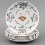 Zes Delfts aardewerk pannenkoekborden met polychroom decor van bloemen en vlinders met centraal 'Amsterdams Bont' bloemenmand, 18e eeuw -randschades, één bord met haarlijn-, Ø 22,5 cm