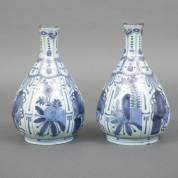 Paar Delfts aardewerk flesvazen met decor in Wanli-stijl, 17e eeuw -één hals gerestaureerd, de ander met chip-, 23 × Ø 14 cm