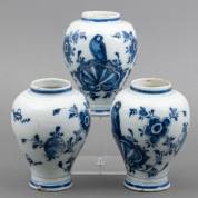 Drie Delfts aardewerk kastvazen met blauw-wit vogeldecor, 18e eeuw -één hals gerestaureerd, één voetrand met chip-, hoogte 17 cm