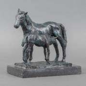 Siem Wardenaar (1934), merrie met veulen, blauwgepatineerd brons, gemonogrammeerd, op stenen basement, totale maat 22 × 23 × 12 cm