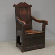 Eiken armstoel met gesloten front en gekrulde arm- en rugleuningen, Engeland, 17e eeuw -reparatie aan armleuning-