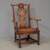 Iepen- en eikenhouten lage armstoel met gesneden ornament in de rug, Engeland, begin 18e eeuw