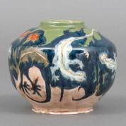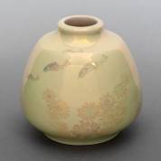 Plateel aardewerk vaasje met iriserend decor: vissen tussen bloemen, model 46, decor F, uitvoering St. Lukas, Utrecht -enkele krasjes in glazuur-, hoogte 12,5 cm