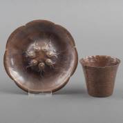 Gedreven koperen beker, uitvoering Frans Zwollo Sr., gemerkt, begin 20e eeuw, en gedreven koperen schaaltje met symmetrisch decor, Amsterdamse School, verso gemerkt GJK, Ø 19,7 cm