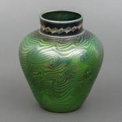 Tiffany Studios: groene en iriserend glazen 'Byzantine vase' met 'Favrile'-decor, gemerkt L.C. Tiffany, Favrile, ontwerp Louis Comfort Tiffany (1848-1933) uitvoering Tiffany Studios, circa 1910 -enkele minieme blaasfoutjes-, 19 × 17 cm, inclusief glazen en notenhouten display