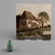 Plateel aardewerk tegel met beschilderd decor van een boerderij naar Charles Dankmeijer, uitvoering Plateelbakkerij Rozenburg, Den Haag, 1906, 15,7 × 15,7 cm, daarbij: plateel aardewerk miniatuurvaasje met lusterglazuur, uitvoering St. Lukas, Utrecht -randbeschadigingen- hoogte 4,7 cm