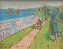 Jan Toorop (1858-1928), figuur met handkar op een dijk, waskrijt op papier, l.o. gesigneerd -horizontale lijn aan onderzijde, deze is aan de linkerkant ingesneden, klein defect midden boven-, 14 × 18 cm