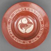 Roodgeglazuurde aardewerk kom met wit decor: centraal een haan, rondom de tekst 'de morgenstond heeft goud in de mond', ontwerp C.J. van der Hoef, 1904, proefmodel voor de productie, gemaakt in de plateelfabriek Haga, Purmerend, 5,5 × 24 cm