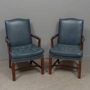 Paar mahonie fauteuils met blauw lederen bekleding, zitkussen gecapitonneerd, modern -zitting met wat slijtage-, 97 × 62 × 60 cm