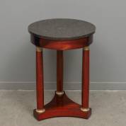 Mahonie gueridon met zwart marmeren blad, gedragen door drie kolommen met messing monturen, empire-stijl, 20e eeuw, 69 × 49,5 cm